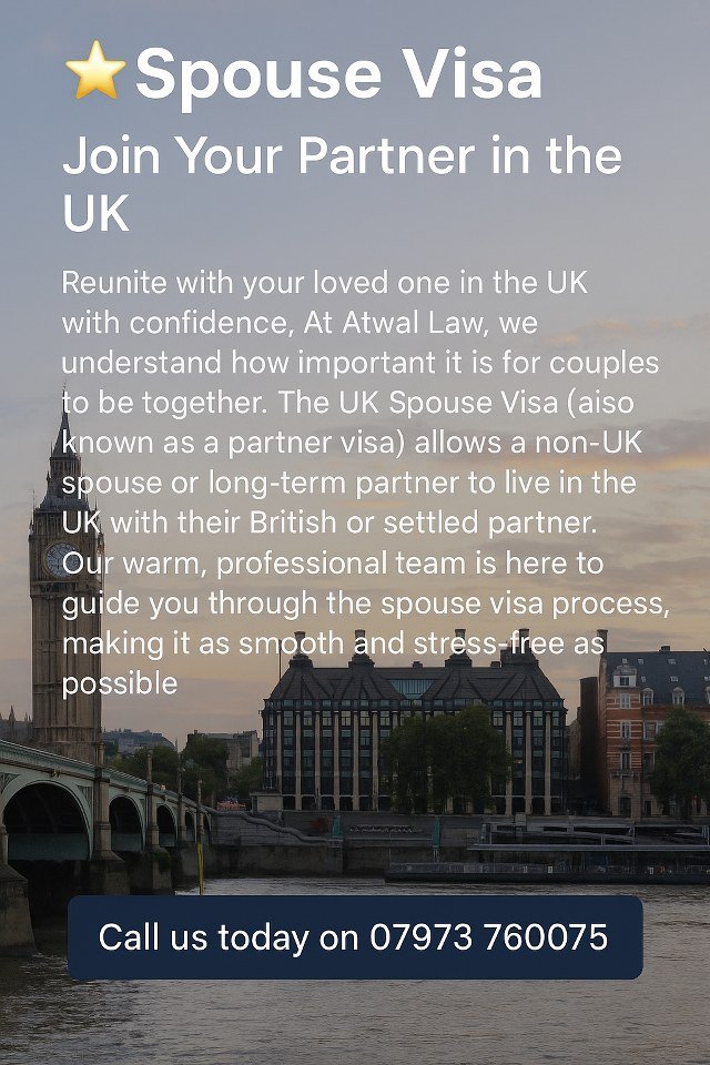 Reunite with your loved one in the UK with confidence. At Atwal Law, we understand how important it is for couples to be together. The UK Spouse Visa (also known as a partner visa) allows a non-UK spouse or long-term partner to live in the UK with their British or settled partner. Our warm, professional team is here to guide you through the spouse visa process, making it as smooth and stress-free as possible.